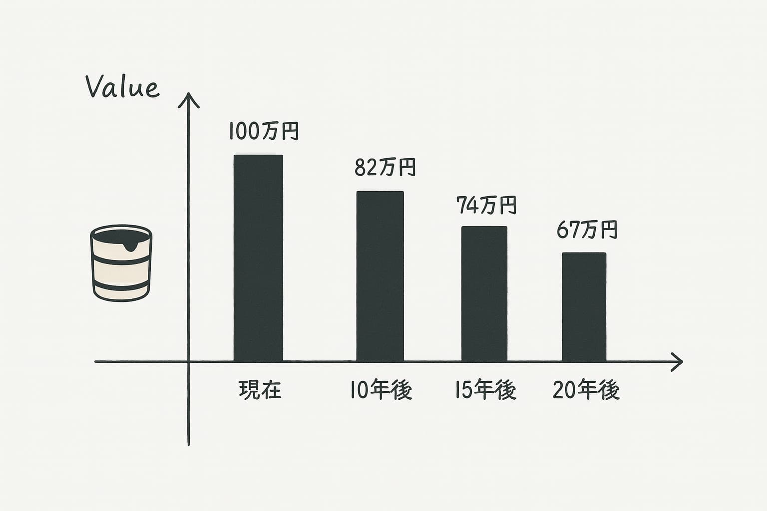 物価が上昇すると、お金の「価値」は確実に減っていきます。インフレ率を年2%と仮定すると、100万円の「価値」は