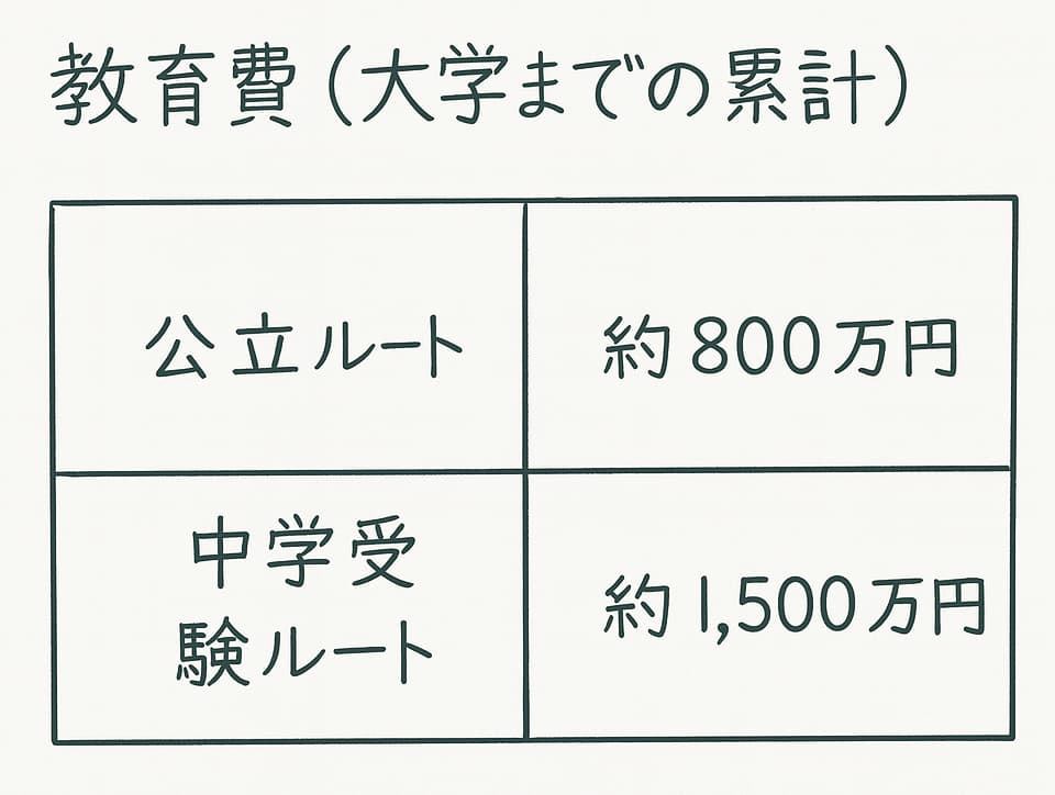 教育費は子どもの進路によって大きく変わります。文部科学省などの調査によると、大学までにかかる教育費の総額はおよそ800万〜1,500万円とされています。