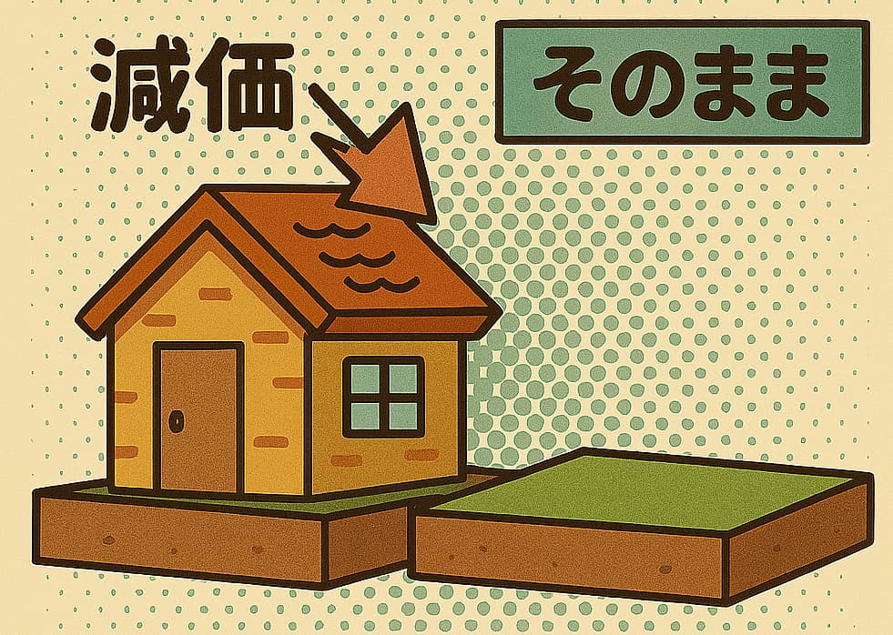 そこで、建物と土地の価値の特性に注目します。建物は『減価』しますが、土地は『減価』しません。(減価とは価値が減るという意味)