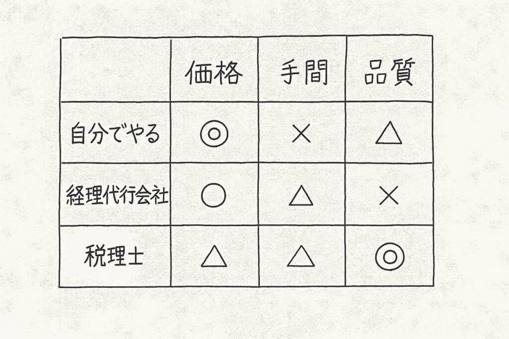 結局、どれも一長一短がありますが、品質を重視すれば税理士に分があるが、コストをかけられない場合は選択肢が限られるというのが現実でしょう。