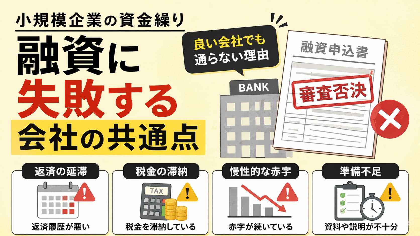 融資の失敗は、特別な理由ではなく、「信用・収益力・準備」のいずれかが欠けていることによって起こります。